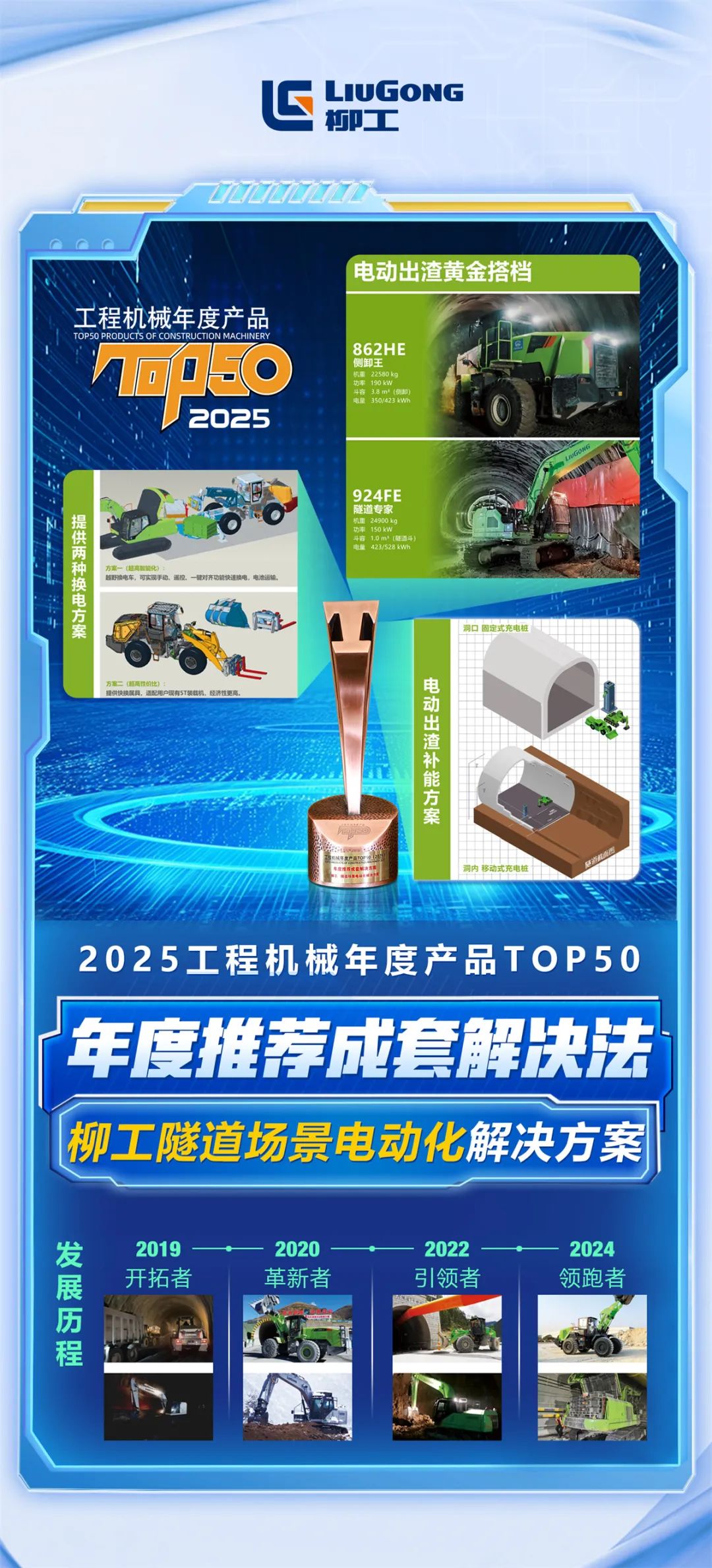 歷經網絡投票、專家初評、評委綜合評審的重重考驗,柳工本次多款明星產品斬獲“金口碑獎”“技術創新金獎”“TOP50產品獎”,隧道場景電動化解決方案榮獲“年度推薦成套解決方案”,展現了柳工品牌在創新驅動、綠智融合、一站式施工解決方案等領域的最新成果與領先實力!
