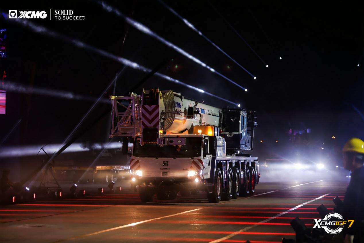 16臺(tái)起重機(jī)列陣如虹,XCA900L8—1全地面起重機(jī)領(lǐng)銜,輪式與履帶產(chǎn)品組成“鋼鐵艦隊(duì)”。車隊(duì)駛過觀禮臺(tái),客戶紛紛舉起手機(jī)定格畫面,客商高呼:“Amazing!”鳴笛聲中,設(shè)備駛向全球,燈光在夜幕中匯成“時(shí)光隧道”,照亮遠(yuǎn)征之路。