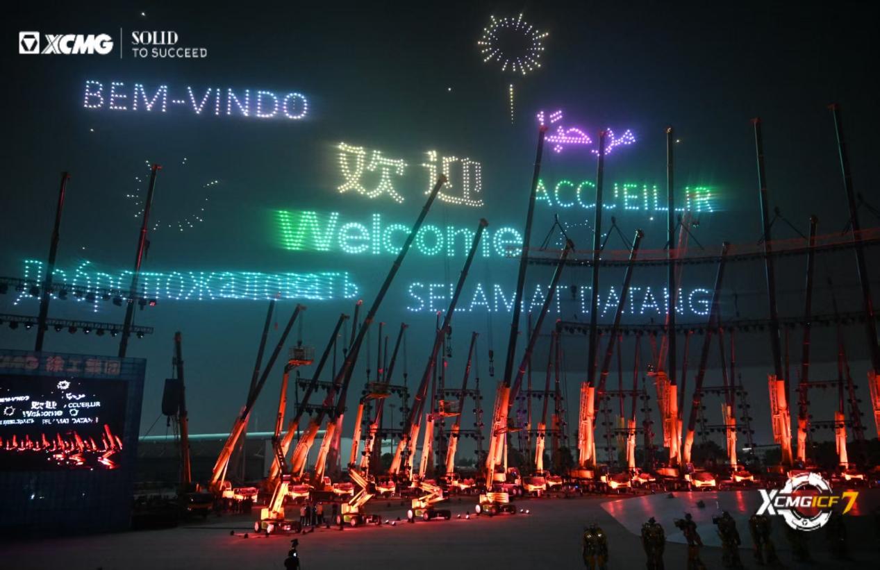 2000架無(wú)人機(jī)以多種語(yǔ)言展示歡迎詞,通過不停變換的徐工元素、徐州文旅元素突出徐州工程機(jī)械夜文化特色,編織了一幅“助建綠色美好未來(lái)”的壯美畫卷。