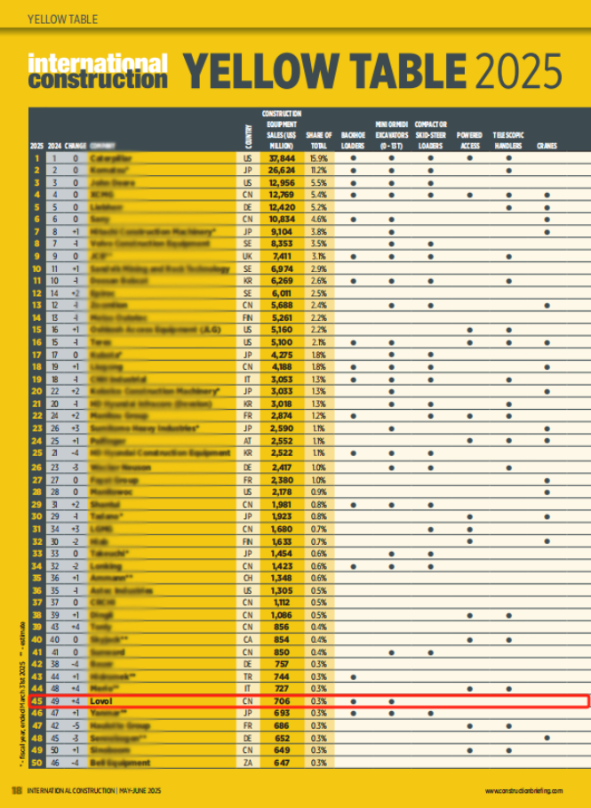 近日,全球工程機械行業權威資訊機構KHL旗下的《International Construction》雜志發布了備受矚目的《Yellow Table 2025》榜單。中國工程機械企業雷沃重工在此次榜單中表現卓越,以7.06億美元的銷售額躍居全球第45位,較2024年大幅提升了4個名次,進一步彰顯了其在工程機械行業的硬核實力。